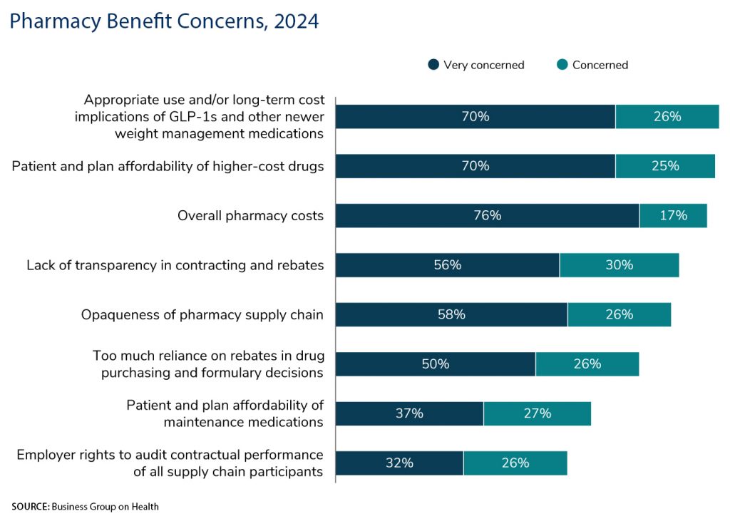 Other top concerns for respondents: Affordability of higher-cost (specialty) drugs, overall pharmacy costs, and lack of transparency in contracting and rebates (see chart).