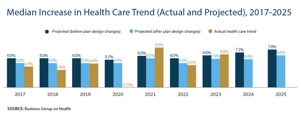 Employers say they expect their health care costs to rise 7.8% next year — the highest estimate in more than 15 years — according to the latest Business Group on Health member survey. Even factoring in cost-reducing plan design changes, respondents project costs to increase 50% from 2017 to 2025 (see chart below).