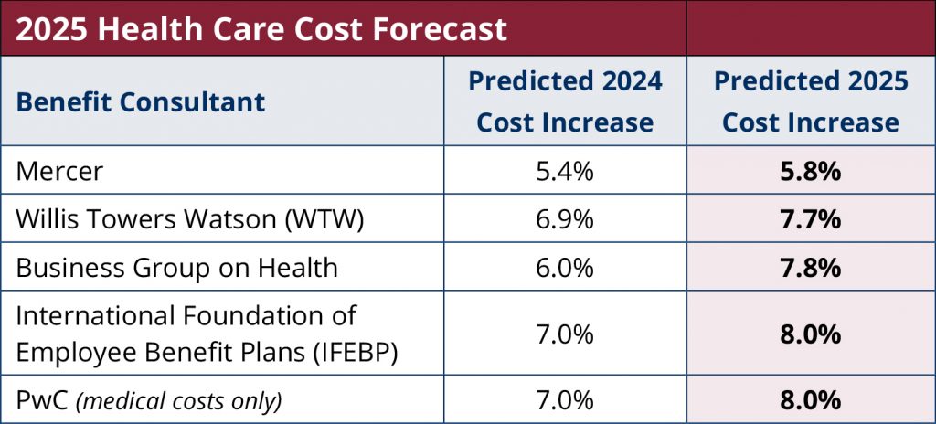 Health care costs in the United States are projected to see their steepest rise in over a decade during 2025, with multiple industry analyses forecasting increases between 7% and 8% year-over-year (see table below). However, MedBen offers solutions that directly address the top drivers of health care spend… solutions that have resulted in a per-member trend of just 2.8% from October 2020 to September 2024.