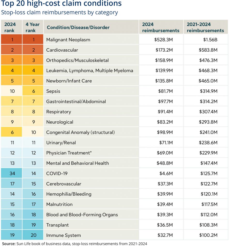 In its 2025 High-Cost Claims and Injectable Drug Trend Analysis, Sun Life highlights a familiar but costly trend: malignant neoplasm (cancer) and cardiovascular disease continue to rank among the top drivers of stop-loss claim reimbursements. These chronic conditions have consistently placed at or near the top of the list for years, underscoring how early detection can make a major difference in both cost and outcomes.