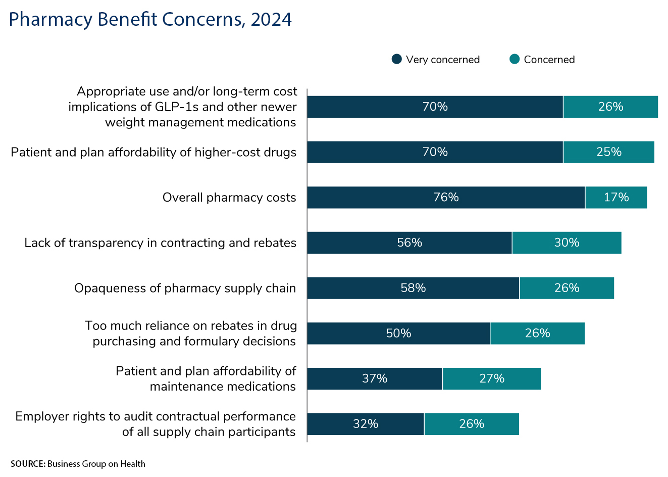 Other top concerns for respondents: Affordability of higher-cost (specialty) drugs, overall pharmacy costs, and lack of transparency in contracting and rebates (see chart).