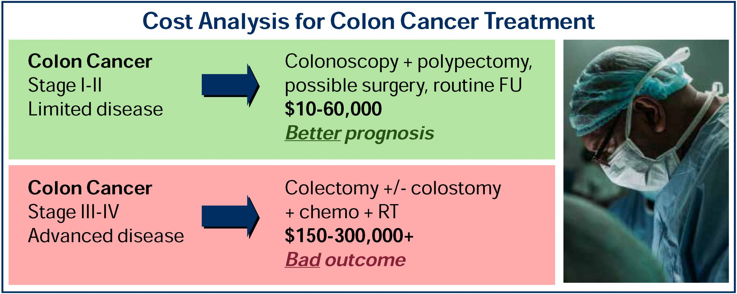 Early detection matters. Treating colon cancer in its earliest stages can cost three to four times less than treating it in later stages, when aggressive therapies, extended hospital stays, and higher complication risks become common.