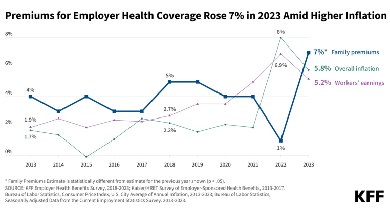 The average annual premium for workers covered by their own firms was $8,435 for single coverage and $23,968 for family coverage in 2023. During the past five years, the average premium for family coverage has risen 22% — again, keeping in line with inflation (21%) as well as wage growth (27%).