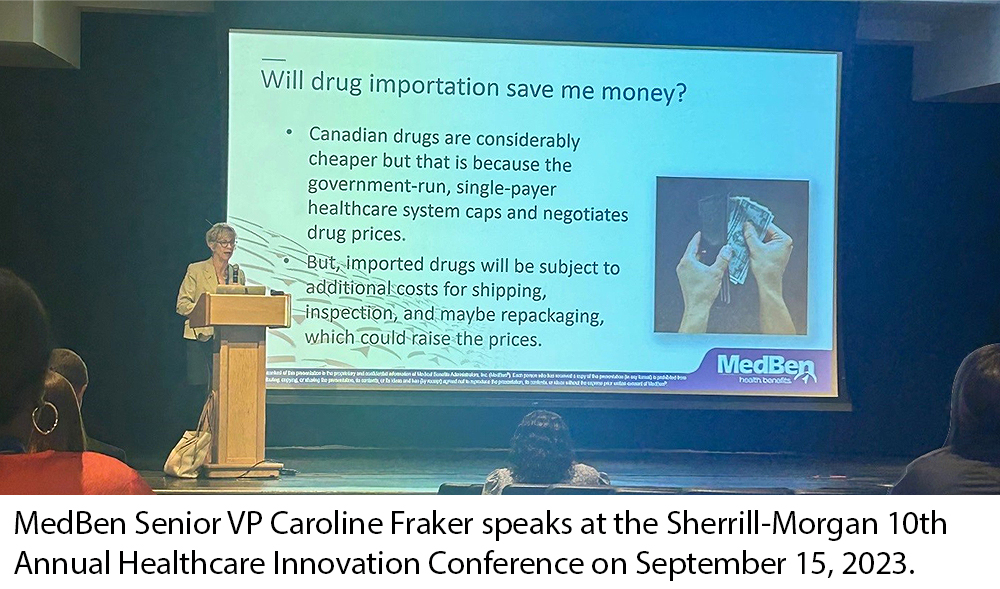 MedBen Senior Vice President Caroline Fraker was a featured speaker at the 10th Annual Sherrill-Morgan Healthcare Innovation Conference on September 15th. She spoke on the topic of drug importation, including the reimportation of U.S. manufactured prescription drugs back into the United States – a practice that, while unlawful, is gaining favor as U.S. drug prices soar.