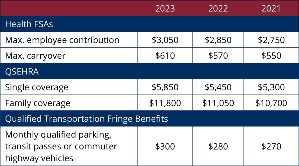 Oct 31, 2022 | Flexible spending accounts (FSAs), Health flexible spending account (FSA), IRS, Qualified small employer health reimbursement (QSEHRA), Qualified transportation fringe benefits
