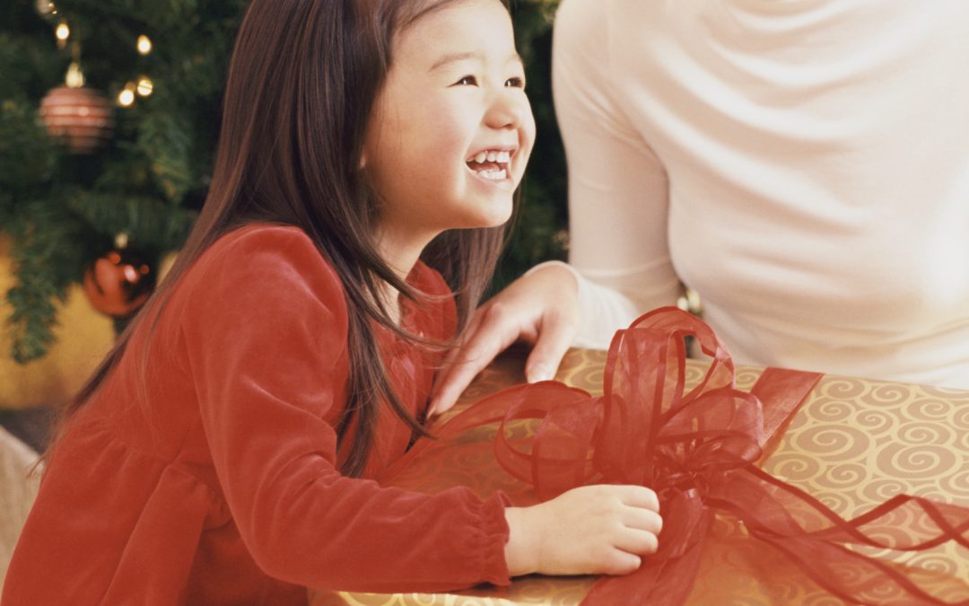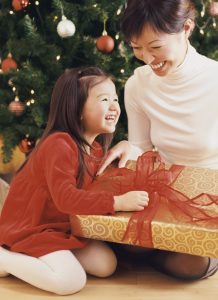 Mother and Daughter Sitting by a Christmas Tree With a Christmas Present