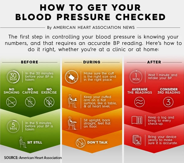 Here are some suggestions for an accurate home blood pressure reading from the American Heart Association (via the Cleveland Clinic website):
