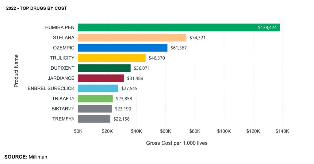 But whether Humira will maintain its top position is an open question. As the report observes, “[t]he market share of Humira compared to its biosimilars is currently in a tenuous position, as manufacturers fiercely compete for preferred formulary positioning with pharmacy benefit managers (PBMs).” MedBen currently offers the Humira biosimilar Idacio at a substantially reduced price, which will save clients nearly $3.3 million in 2024.