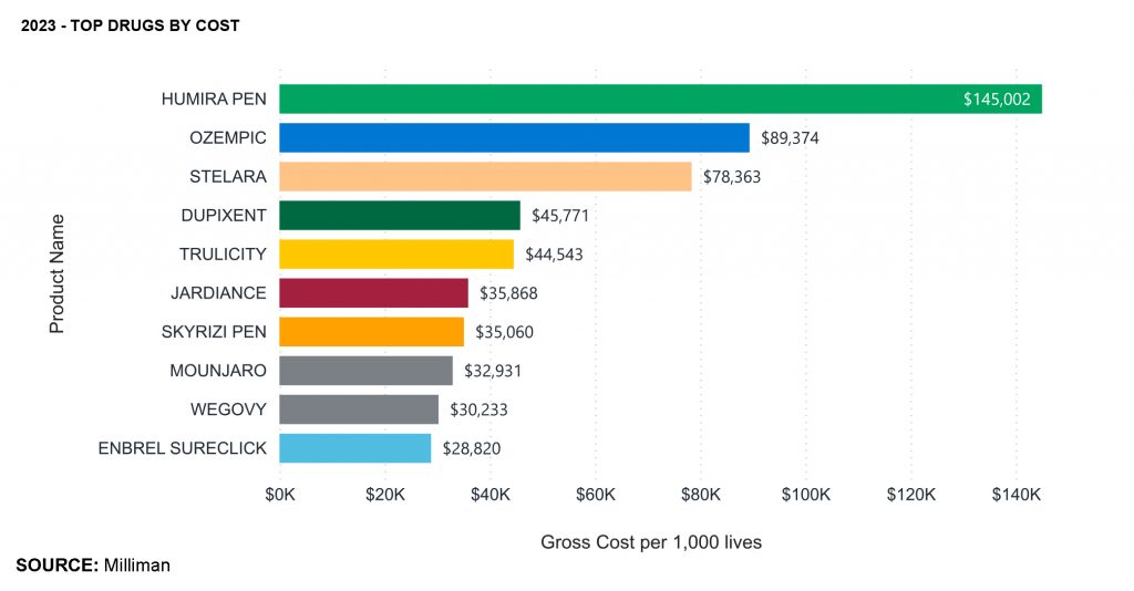 Humira continued to be the costliest prescription drug for self-funded health plans in 2023 by a comfortable margin, according to a recent Milliman commercial drug trends review. Used to treat a variety of conditions from Crohn’s to rheumatoid arthritis and psoriatic arthritis, Humira cost $145,002 per 1,000 lives in 2023 – over $55,000 more than second-place finisher Ozempic.
