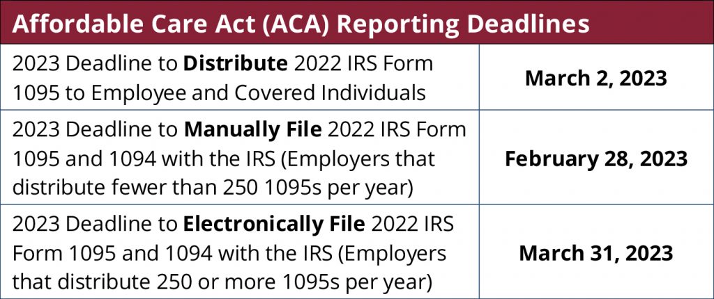 Per the Affordable Care Act, health coverage data collected during 2022 must be aggregated and reported to employees no later than March 2, 2023 on IRS Form 1095 and reported to the IRS no later than February 28, 2023 (if filing by mail) or March 31, 2023 (if filing electronically) on IRS Form 1094. Applicable Large Employers (those with 50 or more employees), or ALEs, must report using the IRS’ C-series forms, and small self-funded employers (those with fewer than 50 employees) offering coverage must report using the IRS’ B-series forms.