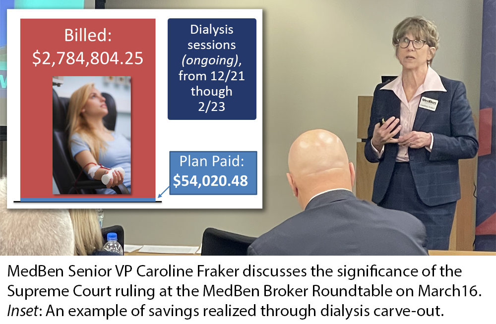 At this year’s MedBen University roundtables, Senior Vice President & CPO Caroline Fraker provided an eye-opening example of why the June 2022 United States Supreme Court decision in the matter of Marietta Memorial Hospital Employee Health Benefit Plan v. DaVita Inc. is so important to self-funded plans and dialysis patients. MedBen, as Marietta Memorial’s third-party administrator, was also sued by DaVita in the underlying court case and was heavily involved in preparing for arguments before the Supreme Court.Â