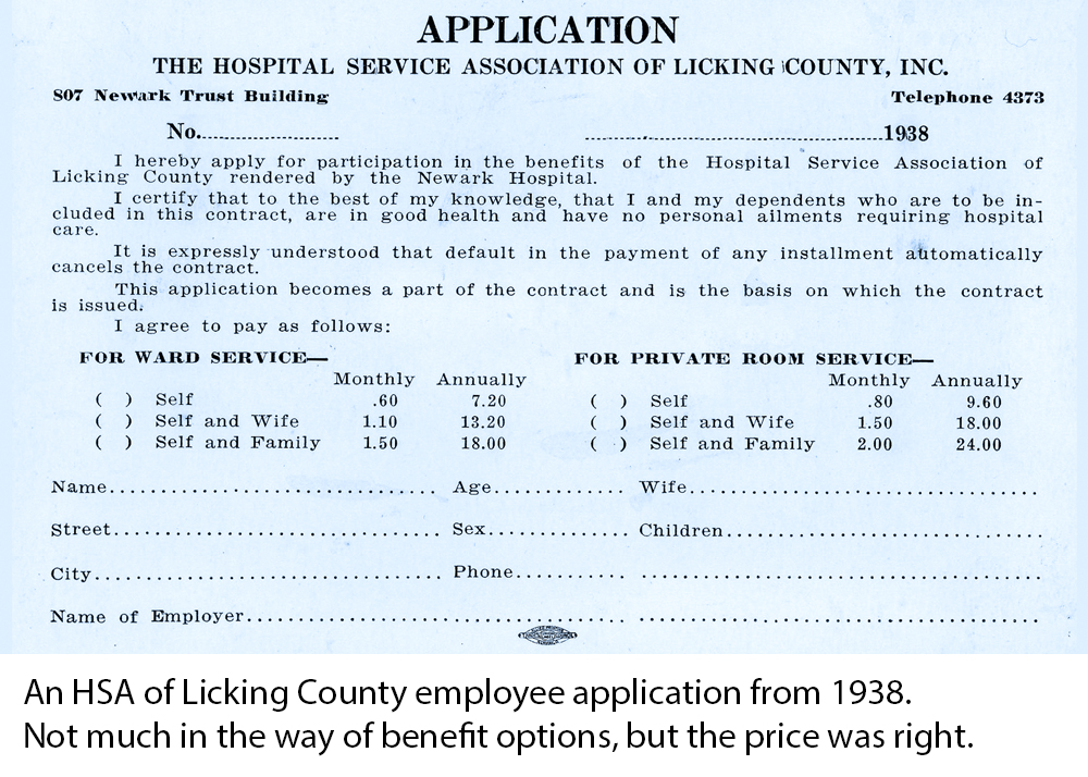 - Starting business as Hospital Service Association of Licking County (later HSA of Ohio), we offered group insurance for hospital room and board only – no doctor’s bills covered.