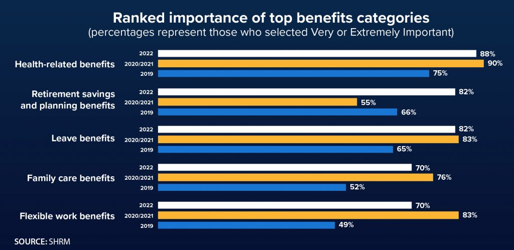 Already ranked as the most important employee benefit an organization can offer its workers, health-related benefits have taken on even greater significance since the onset of COVID-19, according to the 2022 SHRM Employee Benefits Survey. As shown in the graph below, 88% of surveyed employers consider health benefits “Very” or “Extremely Important”… up from 75% in 2019.