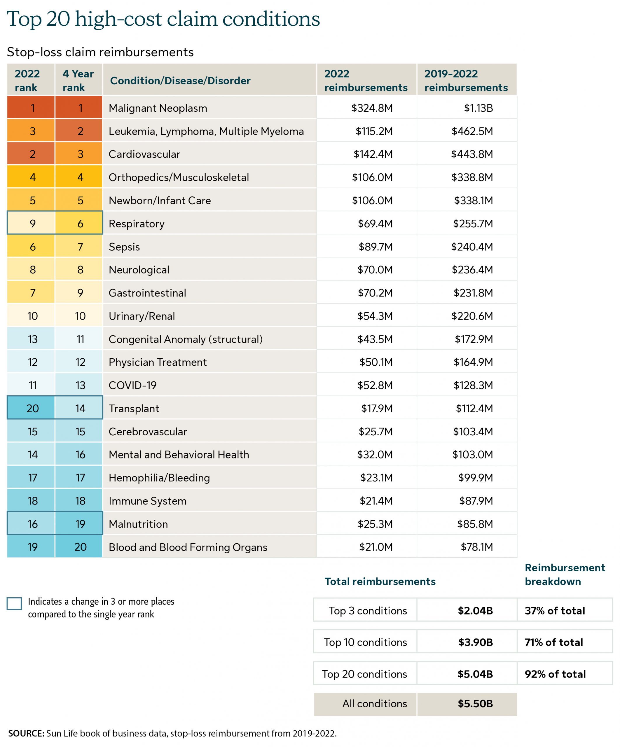 According to the latest high-cost claims and injectable drug trends analysis from stop-loss carrier Sun Life, the top three high-cost claim conditions – Malignant Neoplasm (which includes breast, colon, and other cancers); Leukemia, Lymphoma and Multiple Myeloma; and Cardiovascular – totaled over $2.04 billion in reimbursements from 2019 to 2022.