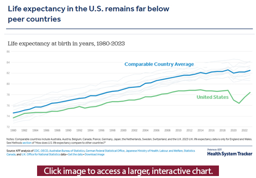 The numbers make the gap clear. Despite spending more per person on health care than any other country, Americans live about four years less on average than peers in Canada, France, Germany, and Switzerland. The KFF chart below shows just how pronounced the difference is.
