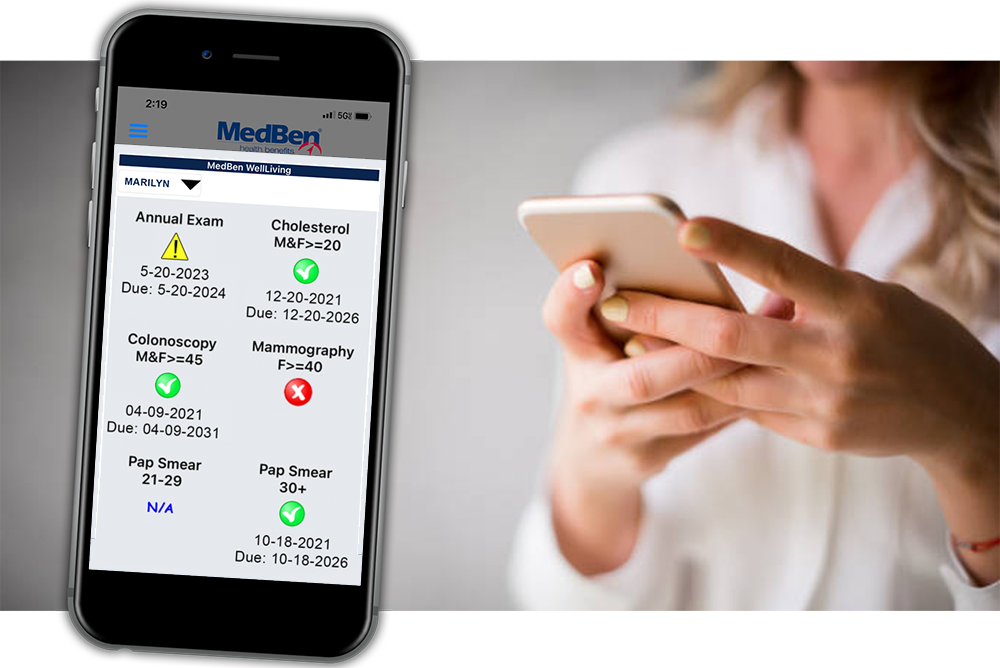 Simply by going to the MedBen Access website or downloading the MedBen Access mobile app, members can check their compliance with annual wellness exams and recommended screenings: